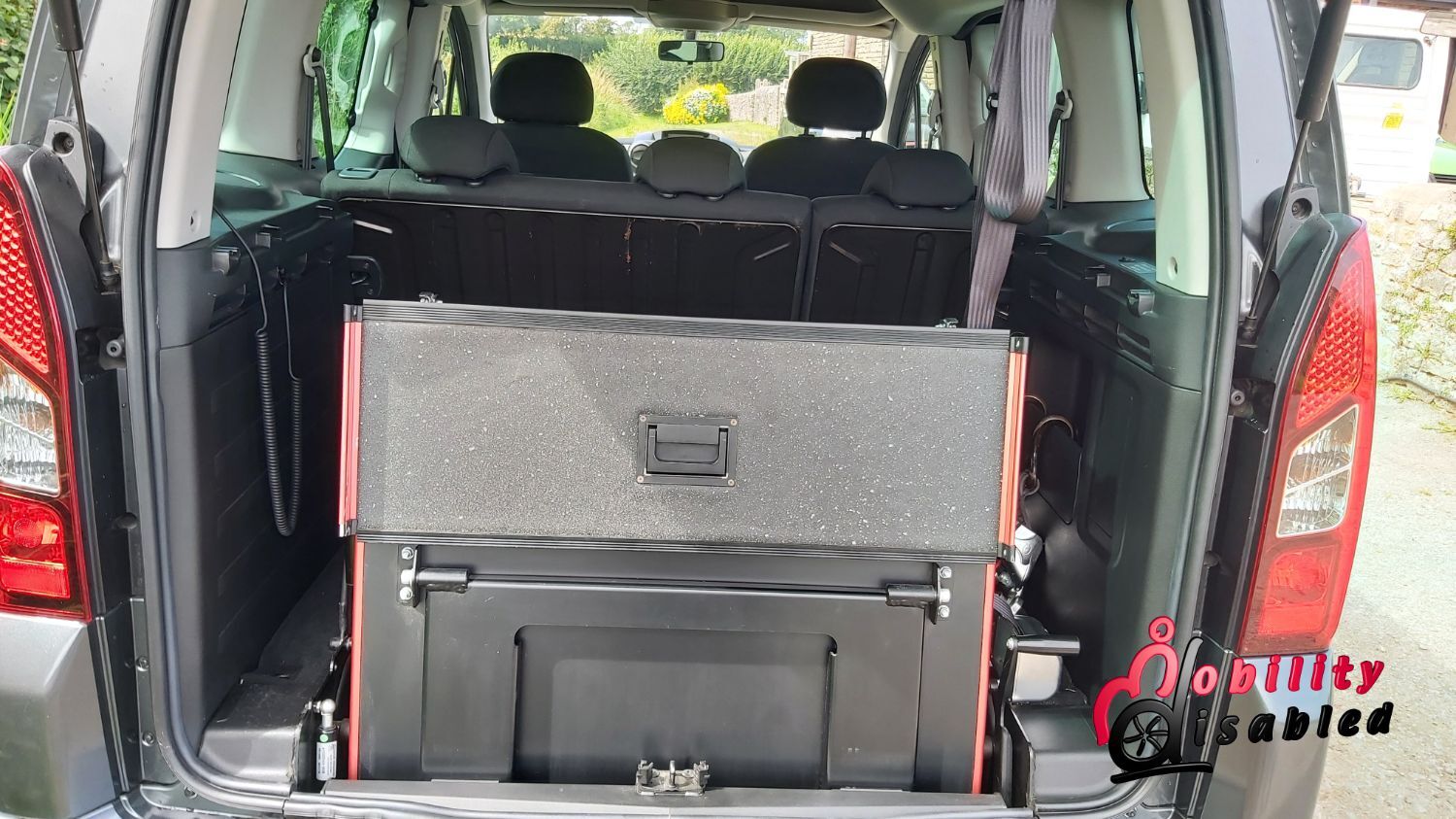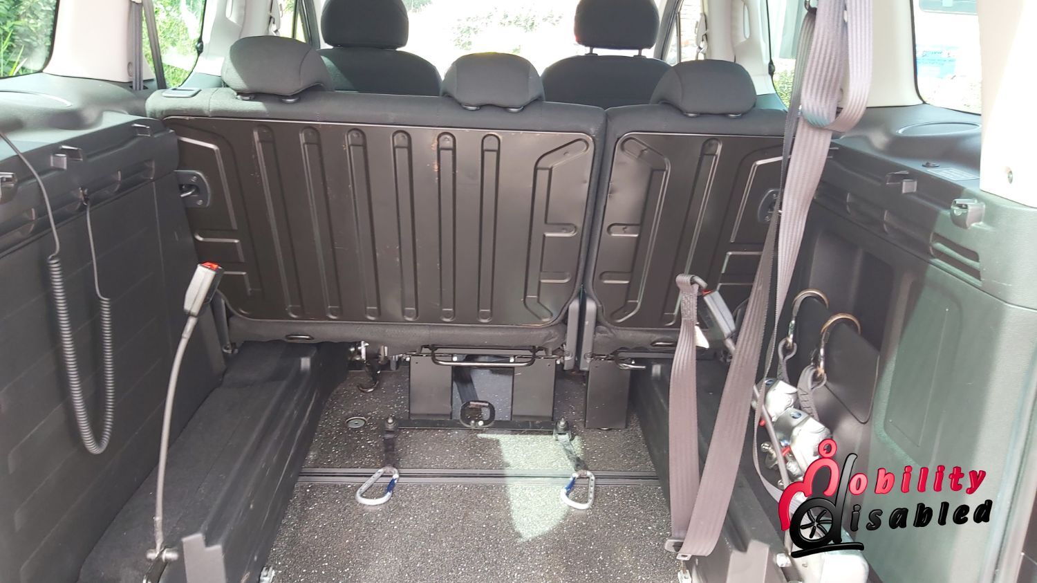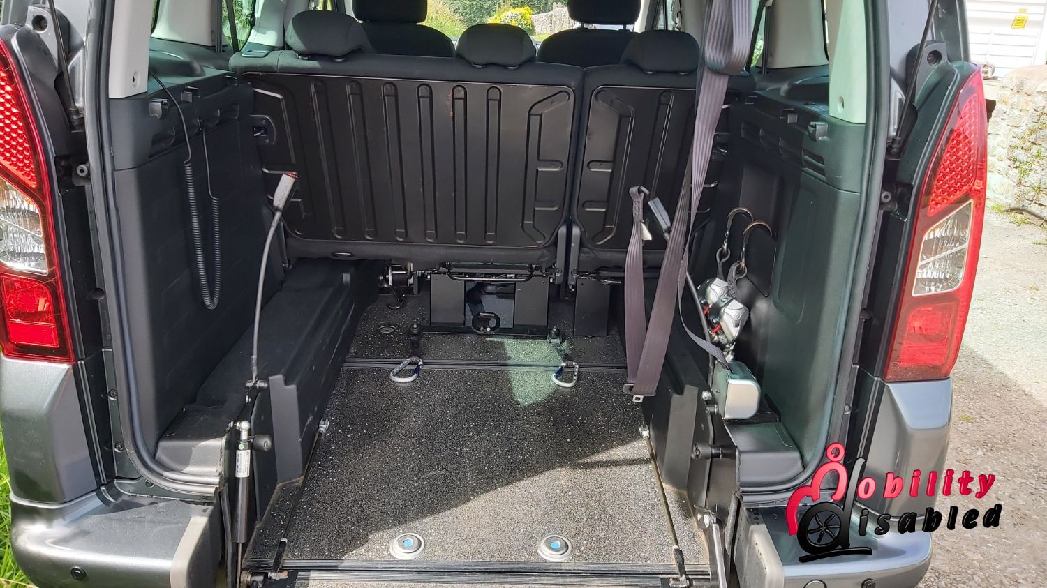 The vehicle itself has been converted into a mobility vehicle. Allied vehicles (who converted this) have lowered the rear floor and provided a manual wheelchair ramp (which does fold-flat) providing a flat surface for luggage and shopping when a wheelchair is not in situ. There are electric front belts and rear manual belts (as well as a 3-point safety seatbelt for the wheelchair occupant). We also have a very handy winch to help take some of the weight of the wheelchair and its user. There are 5 seats in this vehicle (or 3 plus a wheelchair) and ample space for a wheelchair (or scooter).
