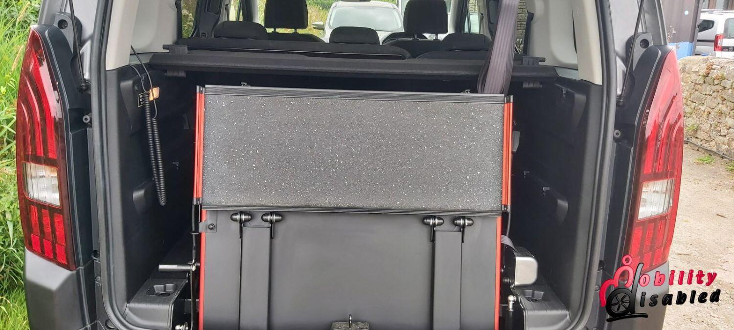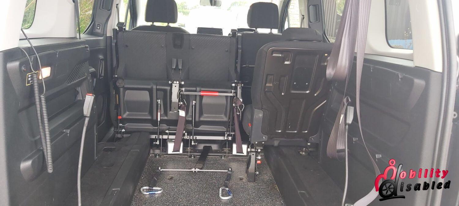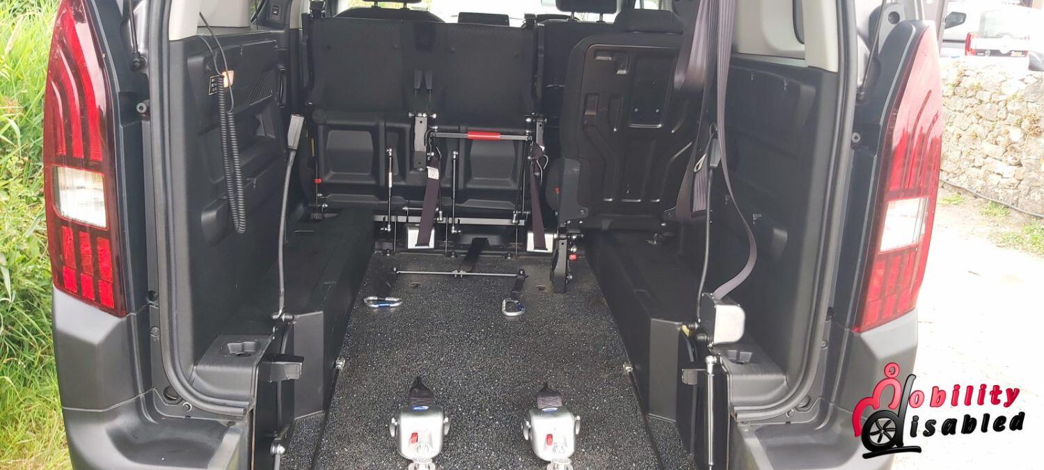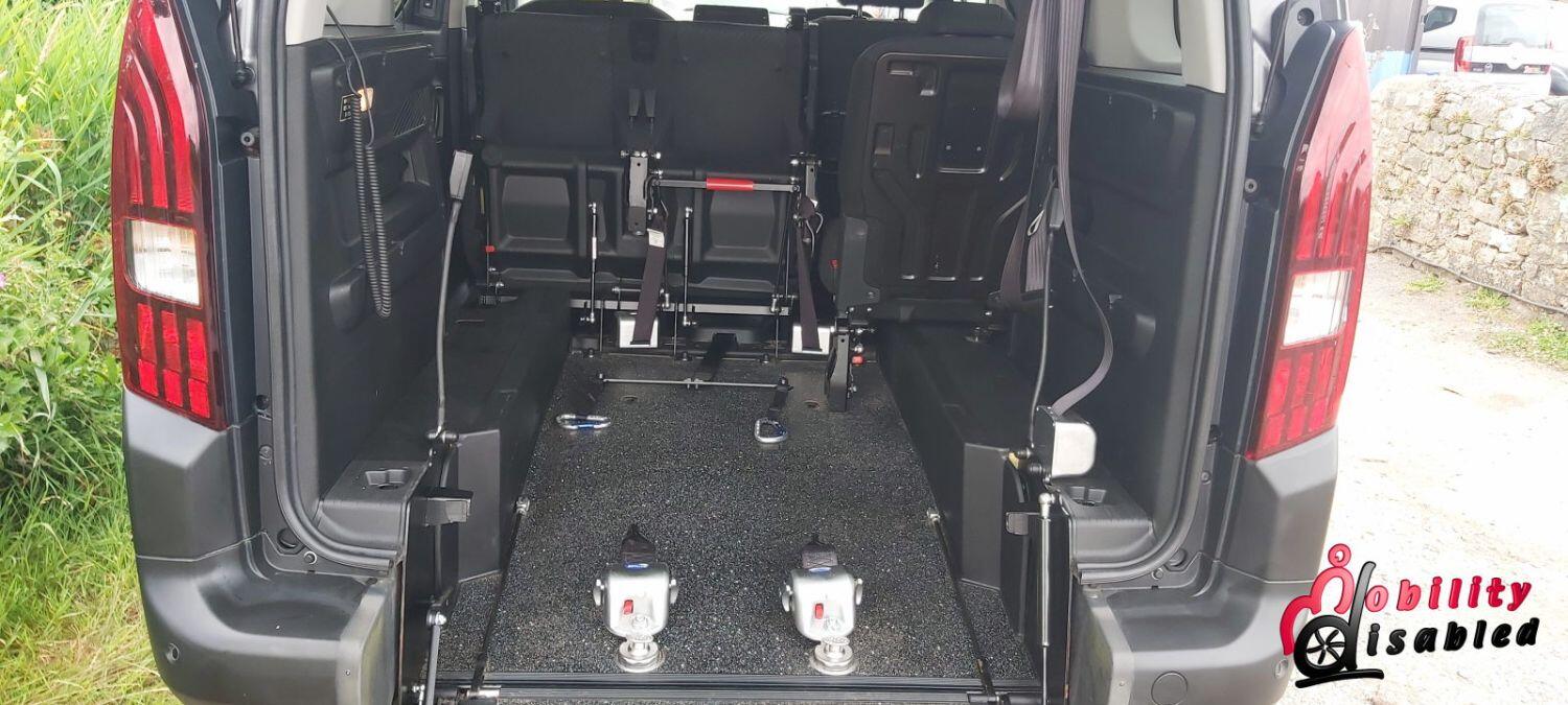 The vehicle itself has been converted into a mobility vehicle. Allied vehicles (who converted this) have lowered the rear floor and provided a manual wheelchair ramp (which does fold-flat providing a flat surface for luggage and shopping when a wheelchair is not in situ). This fold flat ability means the Peugeot is truly multi-purpose. There are electric front belts and rear manual belts (as well as a 3-point safety seatbelt for the wheelchair occupant). We also have a very handy winch to help take some of the weight of the wheelchair and its user. There are 5 seats in this vehicle or 3 plus ample space for a wheelchair (or scooter). So you can use this vehicle as a standard car or a wheelchair vehicle when required.