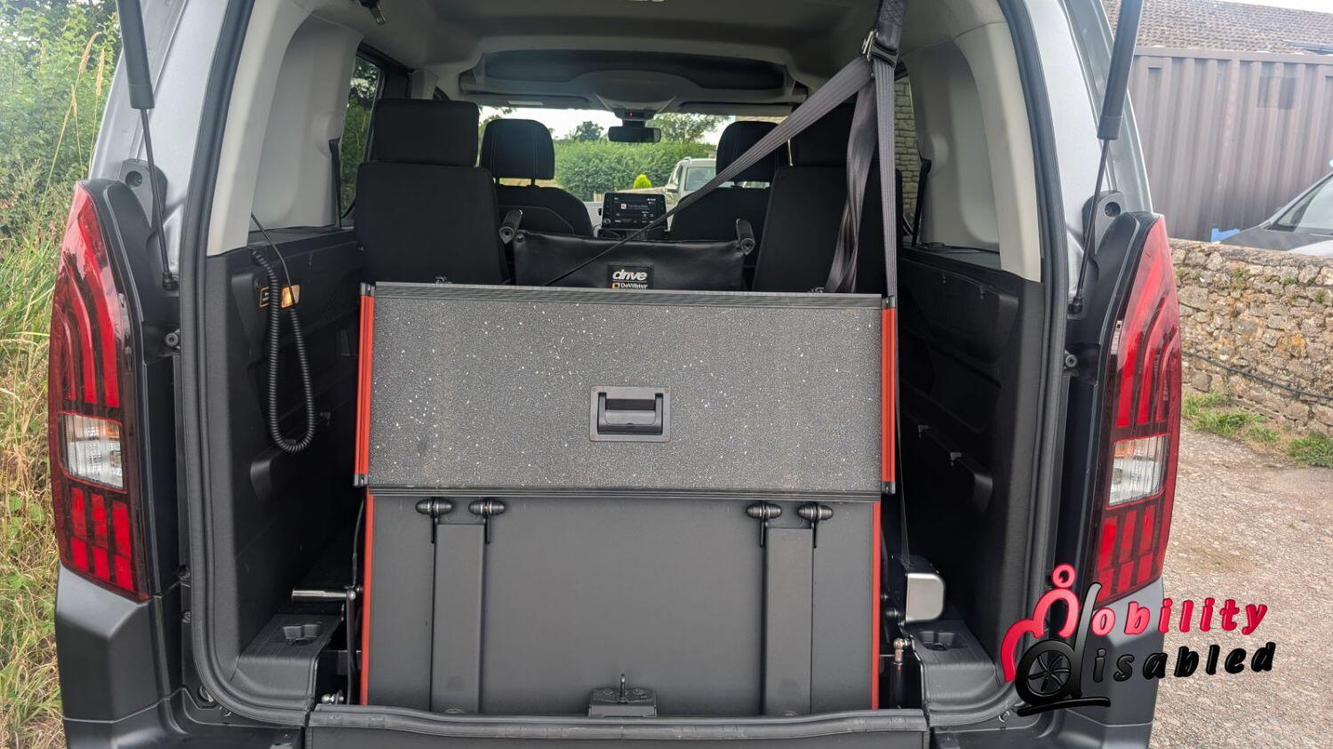 The vehicle itself has been converted into a mobility vehicle. Allied vehicles (who converted this) have lowered the rear floor and provided a manual wheelchair ramp (which does fold-flat providing a flat surface for luggage and shopping when a wheelchair is not in situ). This fold flat ability means the Peugeot is truly multi-purpose. There are electric front belts and rear manual belts (as well as a 3-point safety seatbelt for the wheelchair occupant). We also have a very handy winch to help take some of the weight of the wheelchair and its user. There are 4 seats in this vehicle plus ample space for a wheelchair (or scooter).