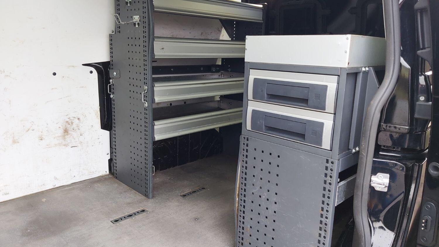 The vehicle itself has been fitted with a work bench and tool chests in the rear, as well as a bulkhead. There are alloy wheels and air conditioning, The front seats have optional heat. There are electric front windows and electric mirrors. We have a screen display for DAB radio etc. There is Bluetooth for both audio and phone. It does have cruise control. There are two keys for the vehicle and remote central locking. Front and rear parking sensors are installed. We also have driver and passenger airbags.
